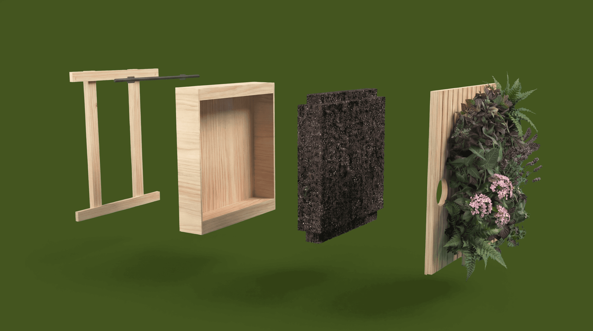 Onze panelen worden op de gevel gemonteerd en zijn gevuld met een regeneratief substraat dat water vasthoudt, voedingsstoffen bevat en planten een gezonde basis geeft. Het systeem wordt aangesloten op de regenwaterafvoer, waardoor de beplanting op natuurlijke wijze wordt gevoed.